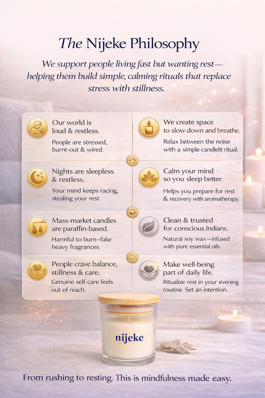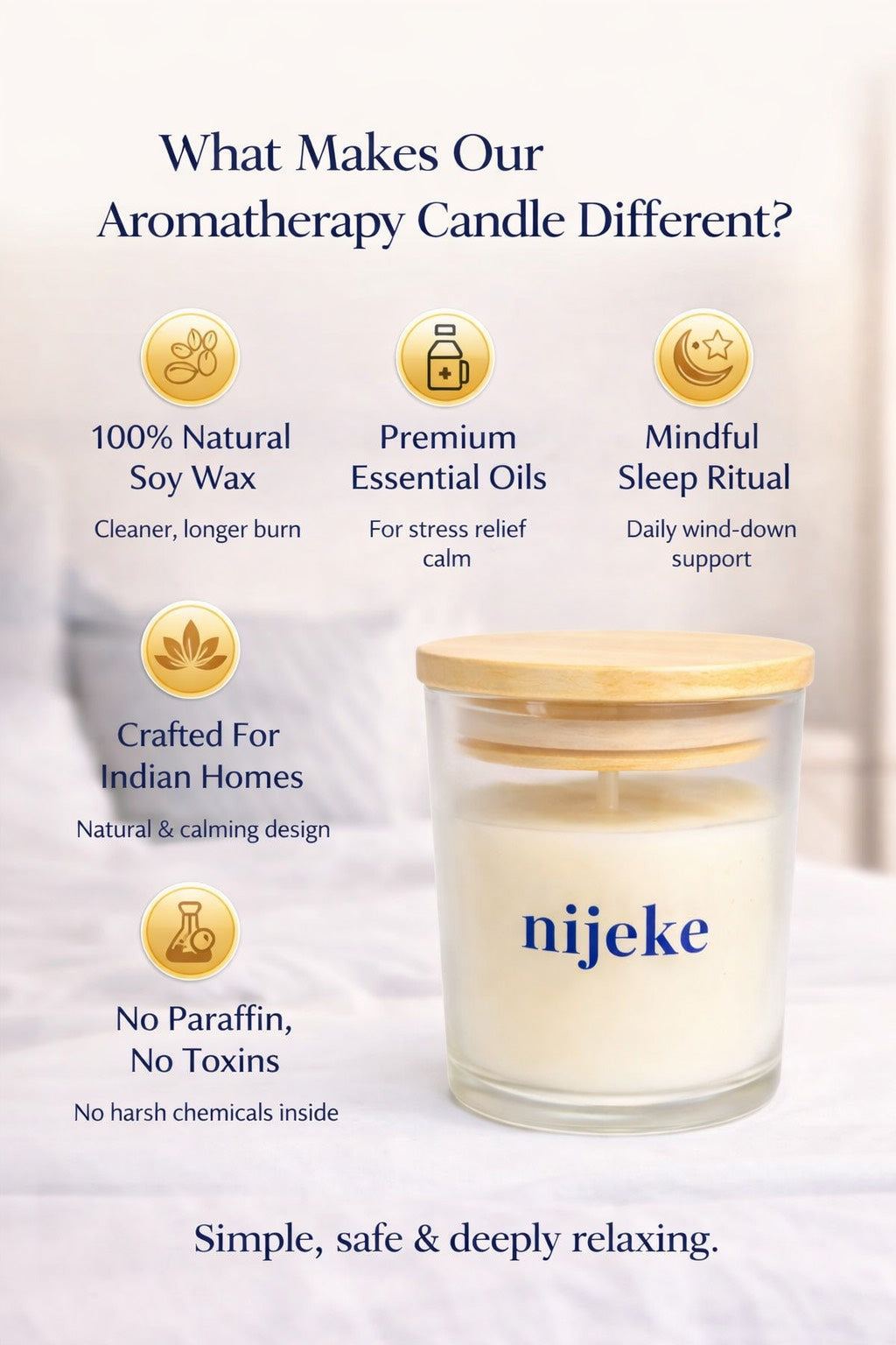 The Nijeke Sleep Candle is hand-poured with natural soy wax and infused with lavender, vetiver and Cedarwood essential oils a grounding aroma designed to calm your mind before rest.